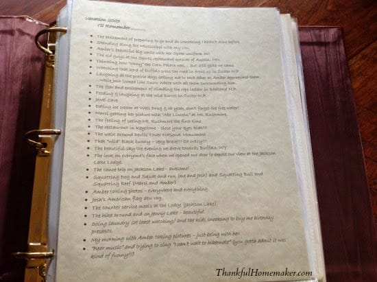 One of my favorite journals was when my husband took time during a trip to write down his favorite one line memories from the trip. We still love to bring out that photo album and read through Dad’s list of top memories. There have been trips I’ve journaled in detail every day and other times I just made quick daily notes to remind us of where we ventured each day. Our kids have kept their own journals from trips and some of them have just been one page hand written summaries of what they enjoyed the most. (Great homeschool assignments!)